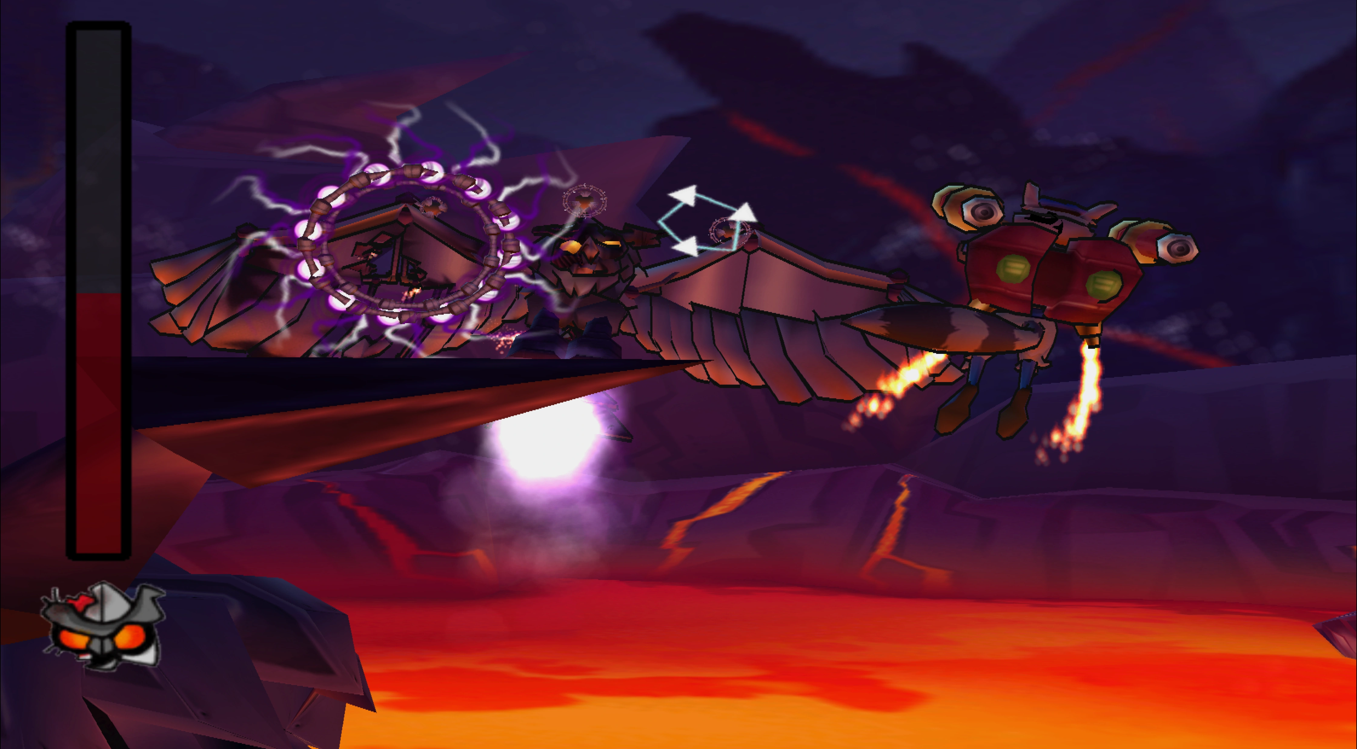 As soon as his head turns around, his HP bar appears and you can then swing your cane repeatedly to destroy it . At this point, he cannot fight back, though his head if you move too close to it can bump you away into the lava.