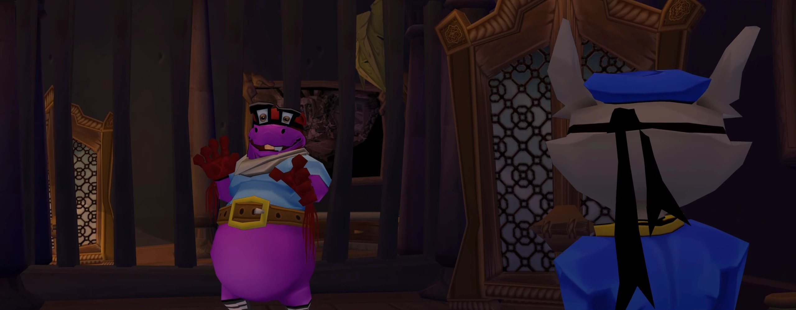 When Sly reached the destination, Murray was nowhere in sight until he dropped down through a skylight, demonstrating his new move, the Thunder Flop, a move that knows neither friend nor foe, only destruction. Using his strength, Murray lifted the gate to let Sly pass, and then destroyed the glass window to Clockwerk's exhibit room, allowing Sly to sneak in.