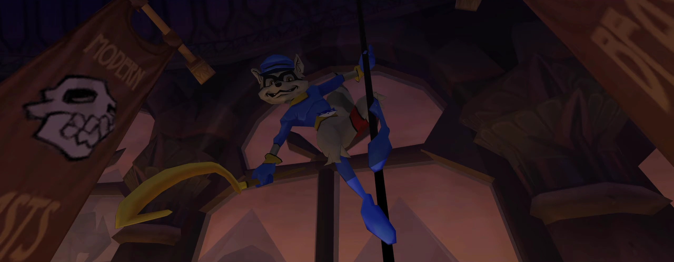 With the two officers briefly distracted with their conversation, Sly took the opportunity to sneak away. Carmelita soon took notice and gave chase. Sly led the chase through a long exhibit hall and was soon accompanied by Bentley and Murray. Upon nearing the end, the three decided to part ways, that way Sly could keep Carmelita distracted while Bentley and Murray could retrieve the team van. Upon reaching the end of the hall, Sly busted through a window and led the chase along the rooftops while the team van was being pursued by police cars below. Sly then slid down to the street below, and the van pulled up just in time for him to jump in through the back. Once Sly was inside, the gang drove off, narrowly missing the fleet of police cars and leaving Carmelita just as furious as ever.