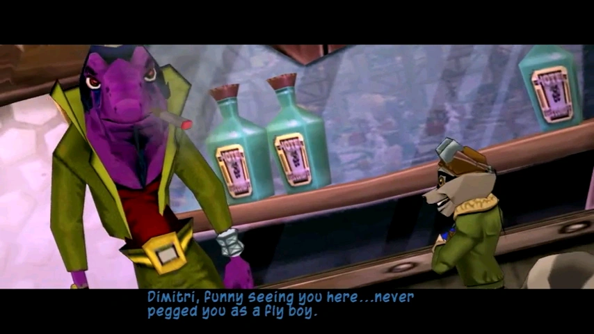 Once finding Dimitri, Sly has him reveal the location of the roster. However, Dimitri refuses to talk for fear of being exposed to the Black Baron and losing his job. Sly offers him a bit of encouragement, saying that a guy like him can deal with the Baron, as he has the best fashion sense of anyone he knows. After hearing this, Dimitri shows renewed pride in his ability to outsmart the Baron. He then agrees to disclose the location of the roster, on the condition that Sly agrees to owe him a favor, which will be returned in a few months.[1] Sly accepts the bargain, then Dimitri tells him to search the Baron's air hangar and look behind one of the paintings; it is kept in a secret safe.