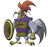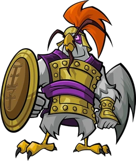 General Tsao is a white-feathered chicken. He wears a purple gi with a golden plate on his torso. He has purple circles under his orange eyes, a yellow beak with a small black Fu Manchu. On his head is a purple and gold helmet with a large red feather and around his wrists are golden cuffs.