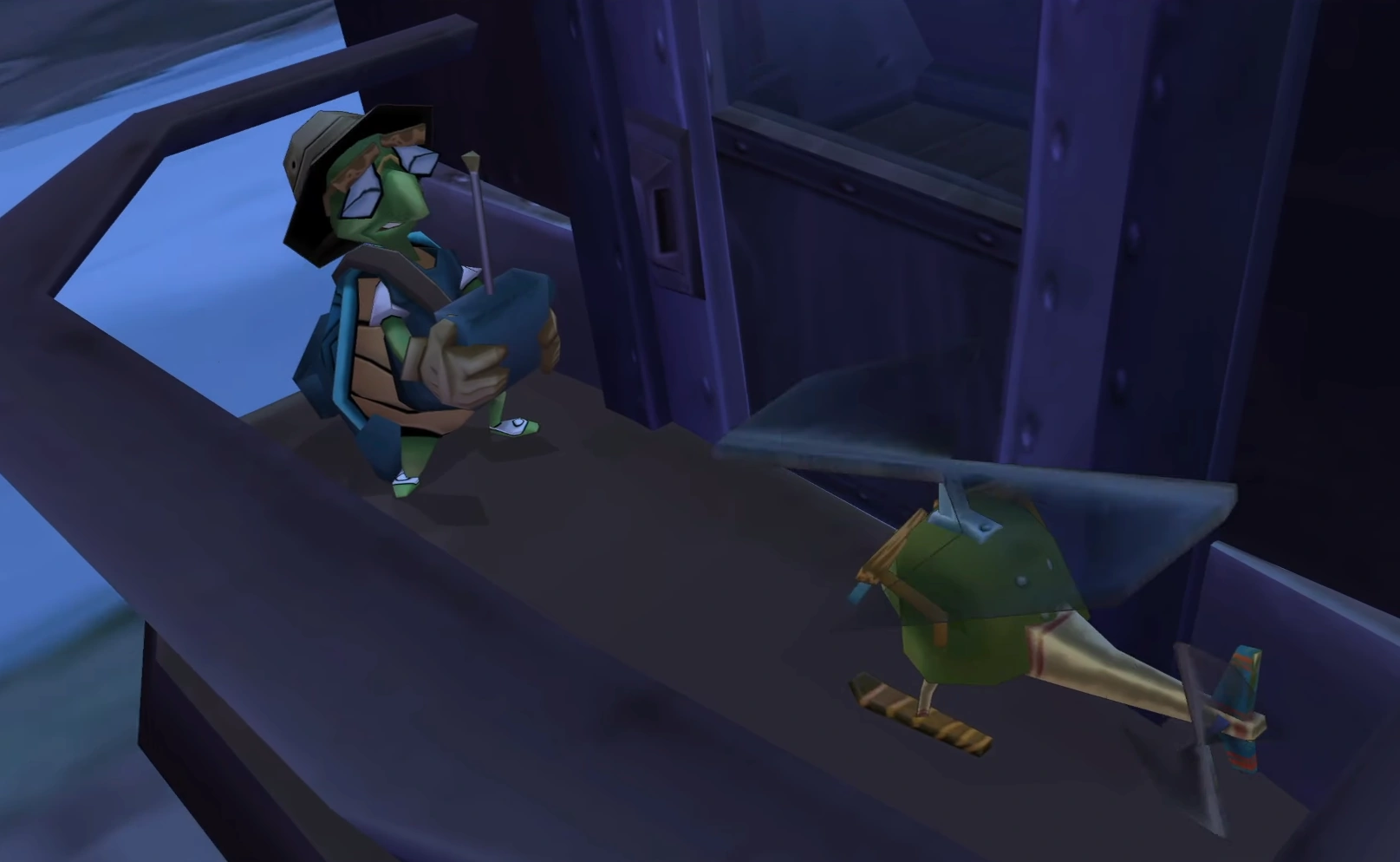 After making his way past several of Jean Bison's guards, Sly reached the train car where Bison himself was. He was able to sneak by, but was then confronted by Neyla on her new aircraft. Neyla challenged Sly to fight her, but Sly instead contacted his "little friends", as Neyla put it, for backup.