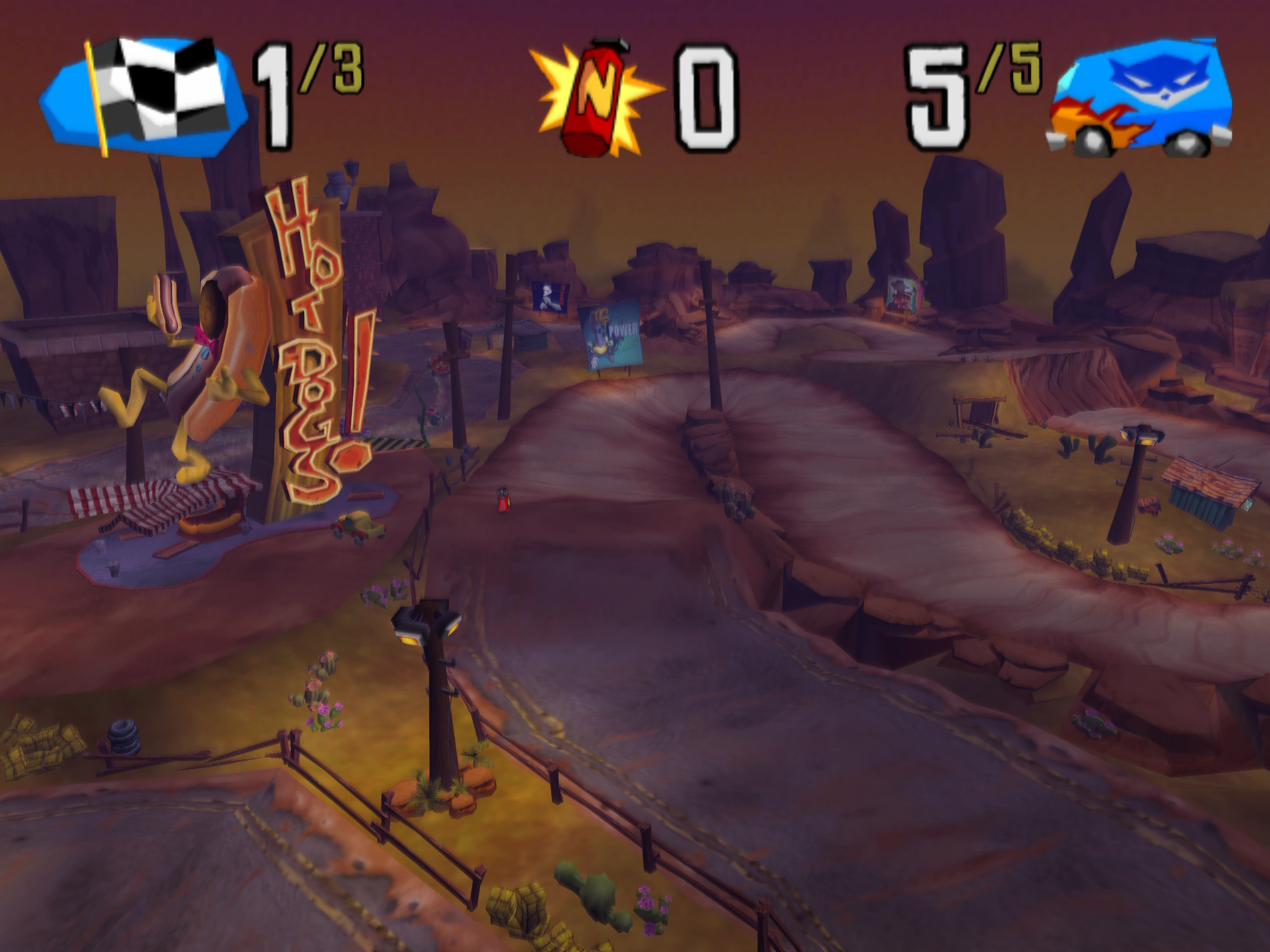Located west of the casino is a short route surrounding a hot dog stand. This was where the mission "At the Dog Track" took place. The race route features several tight corners and short jumps. About half of the race track is on a regular road, while the rest is on dirt. During a race, several nitro-boosts are placed throughout, allowing the driver to gain a speed boost. The hot dog stand was where Murray was originally visiting, to get a quick snack, prior to the race. Along the race track, one can see a Sucker Punch Productions poster, plus a poster of the Panda King.