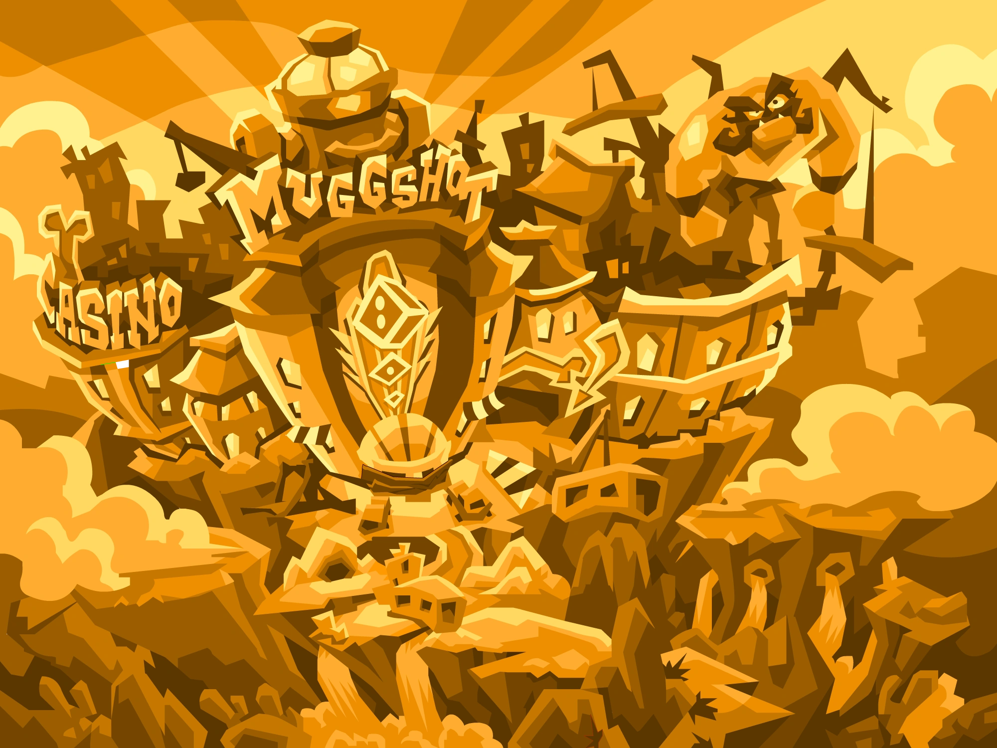 Muggshot's penthouse is located within his massive casino. It can be accessed through an elevator hidden within a giant Muggshot head. On the inside are three floors, serving as the setup for the boss battle "Last Call." There are also high degrees of sunlight emitting from the windows.