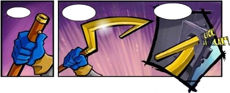 In The Adventures of Sly Cooper Issue 2, Sly sneaks his cane into Heathrow Penitentiary by disguising it as a prison guard stick.[21] Later in the comic, he extends the hook to pick a lock.[15] The cane has only done this in the comic.