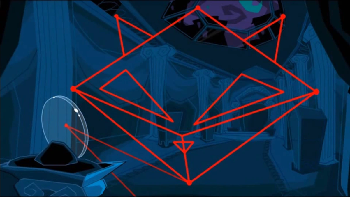 Sly Cooper is seen on the roof cutting a circular hole in the skylight, catching the glass piece that falls in with his cane. He then jumps inside the room and bounds easily around the laser security. Smashing the glass case of the stamp, he replaces it with the glass piece. This bounces the lasers around the room, forming his signature insignia, making for a more unique approach to his leaving of a standard calling card.