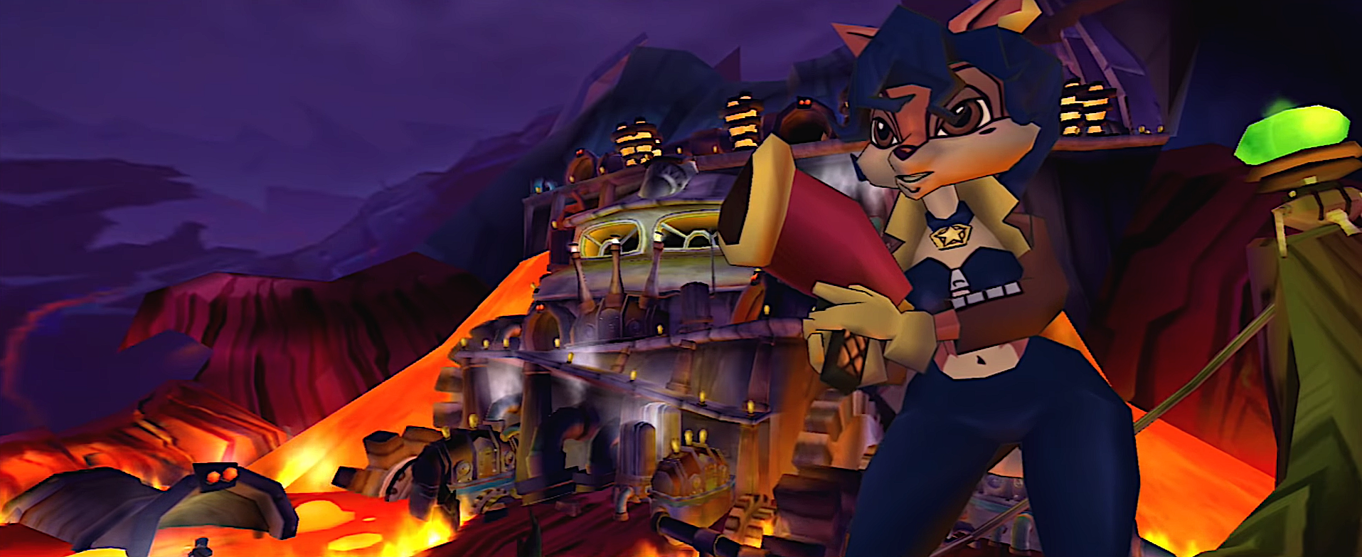 After recovering his cane, Sly made his way to Clockwerk's death ray, where Carmelita Fox had stashed her jetpack before Clockwerk captured her. Unfortunately, the magnatronic support fields for the death ray have been destroyed due to Carmelita's shooting, and the whole machine was about to fall apart soon. Sly had to reach the jetpack before the lava destroyed him.