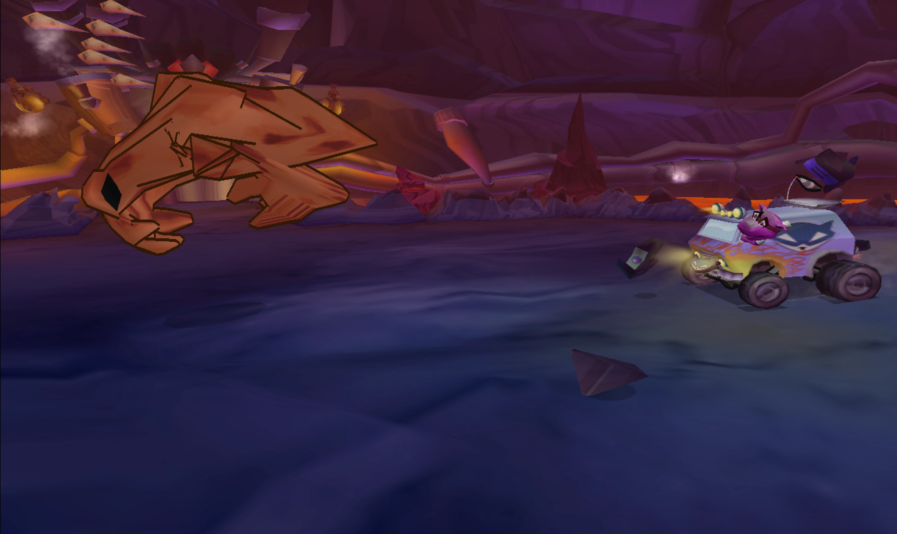 As they further approached the tower, Bentley realized that it was actually Clockwerk's death ray, which began striking the volcanic walls, creating huge boulders that rolled down towards the path the van was on. Sly was able to shoot them out, but it was not long until they faced several more obstacles and two more swarms of robo-falcons. After doing so, they finally approached their destination: a cave that led into a lava-filled cavern. However, Sly noticed that the cave was too low for the turret to pass all the way through and tried to warn Murray before passing through.
