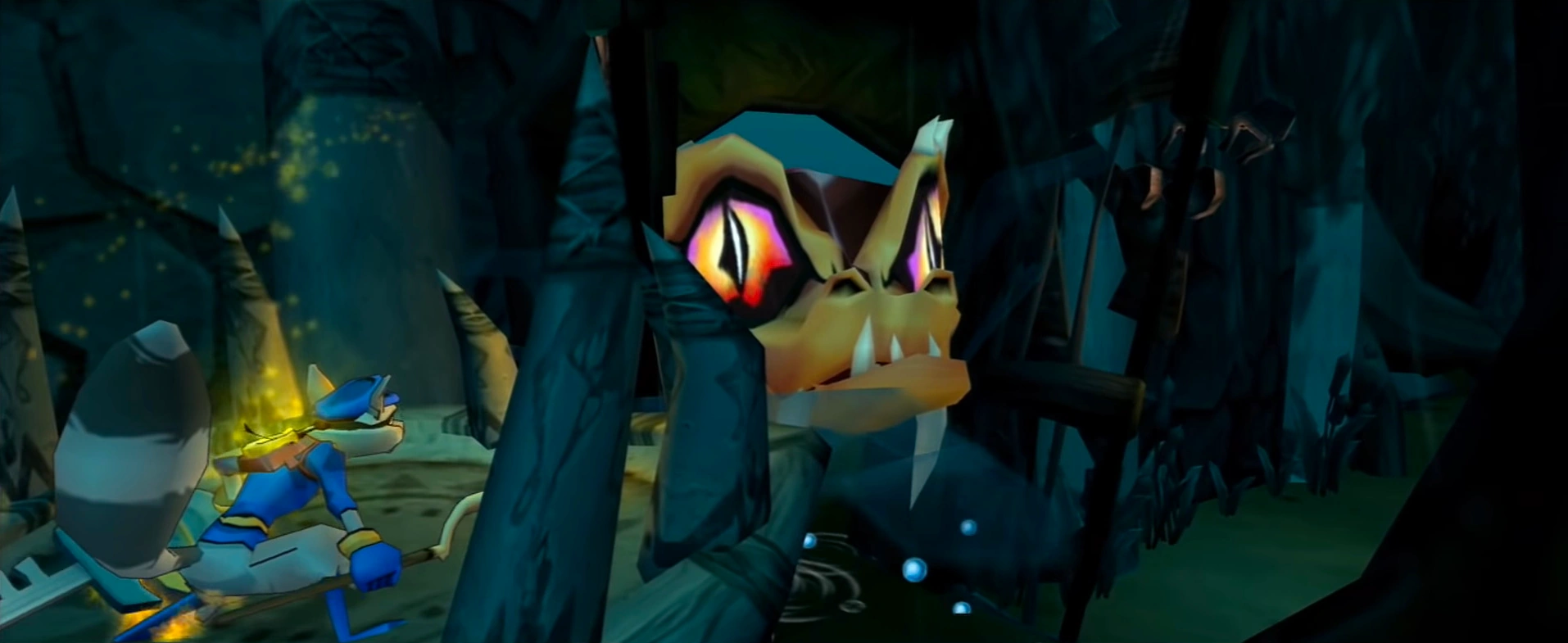 Sly stumbled upon a gigantic voodoo gate that Mz. Ruby apparently built to keep something from entering or escaping. Sly climbed up and around the gate, entering into a swamp-filled lair, which happened to be home to a massive sea serpent known as the Beast. As Sly ventured through the swamp, Bentley took note of the moving reeds and advised Sly to keep moving. Sly eventually encountered the creature, who awakened and gave chase to him through a thicket. Sly barely made it to the treasure key before the Beast retreated into the swamp.