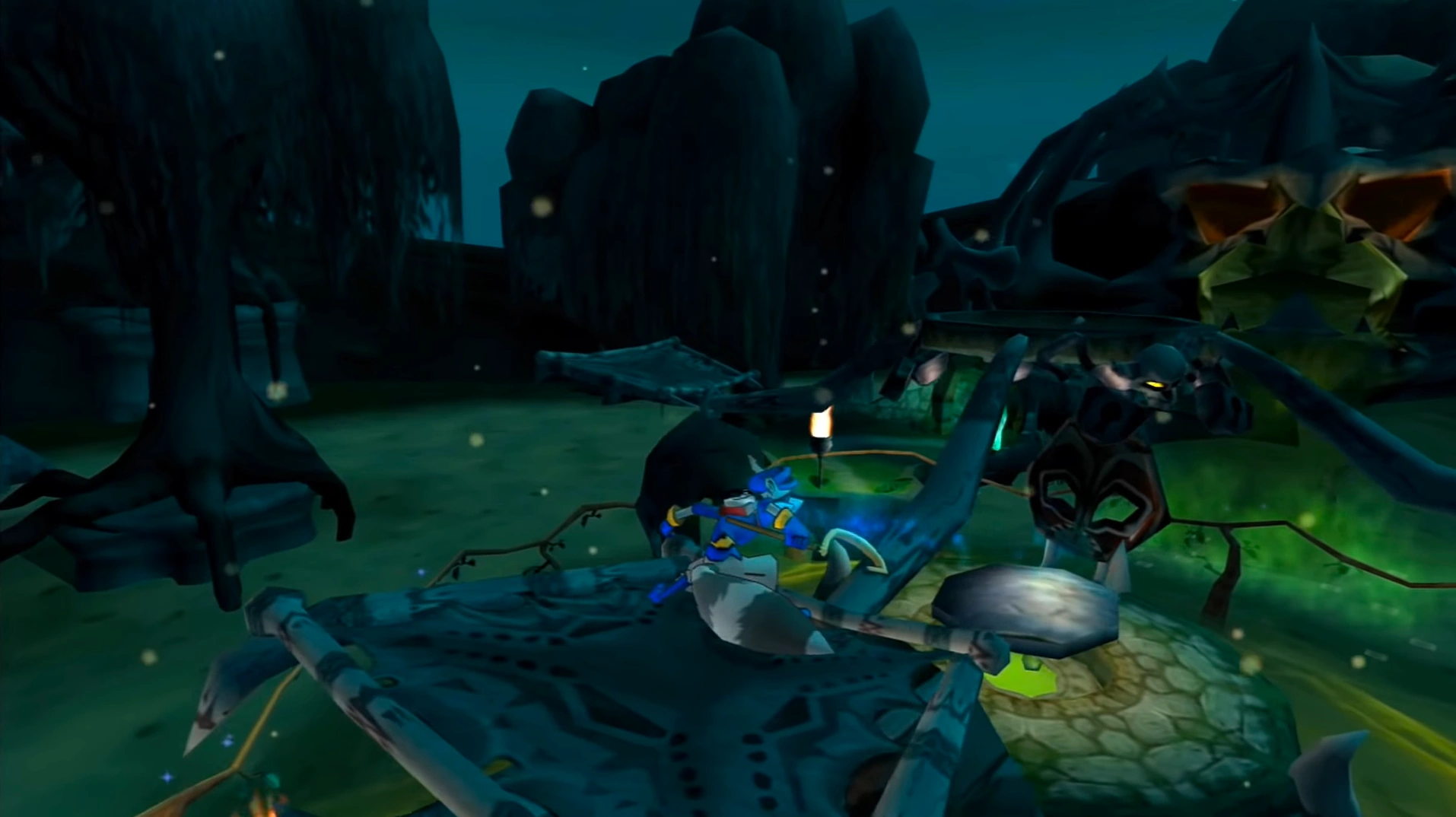 To navigate the treacherous terrain of the swamp path, Sly utilized the new Rail Walk move he had recently learned from Muggshot's section of the Thievius Raccoonus. He slid across both standard and slippery vines to explore the area and progress deeper into the swamp.